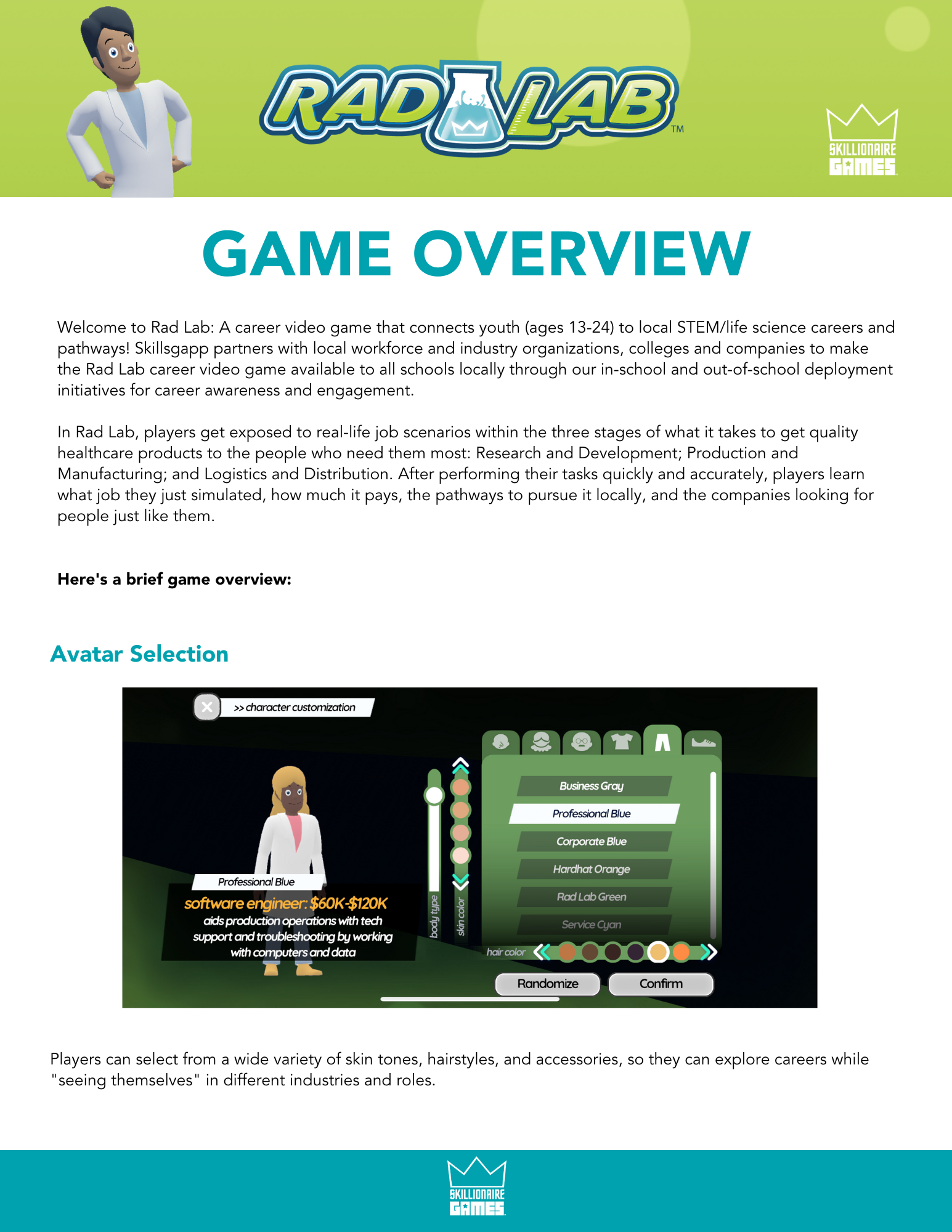 Rad Lab was designed for meaningful impact with minimal effort from educators. Students can launch the game as new players or through Google Single Sign-On, set up their avatar in under five minutes, and then jump straight into gameplay and industry-informed environments. To ensure students see the Inland Empire’s most relevant career pathways and local companies, please have them enter their local ZIP code during account setup.