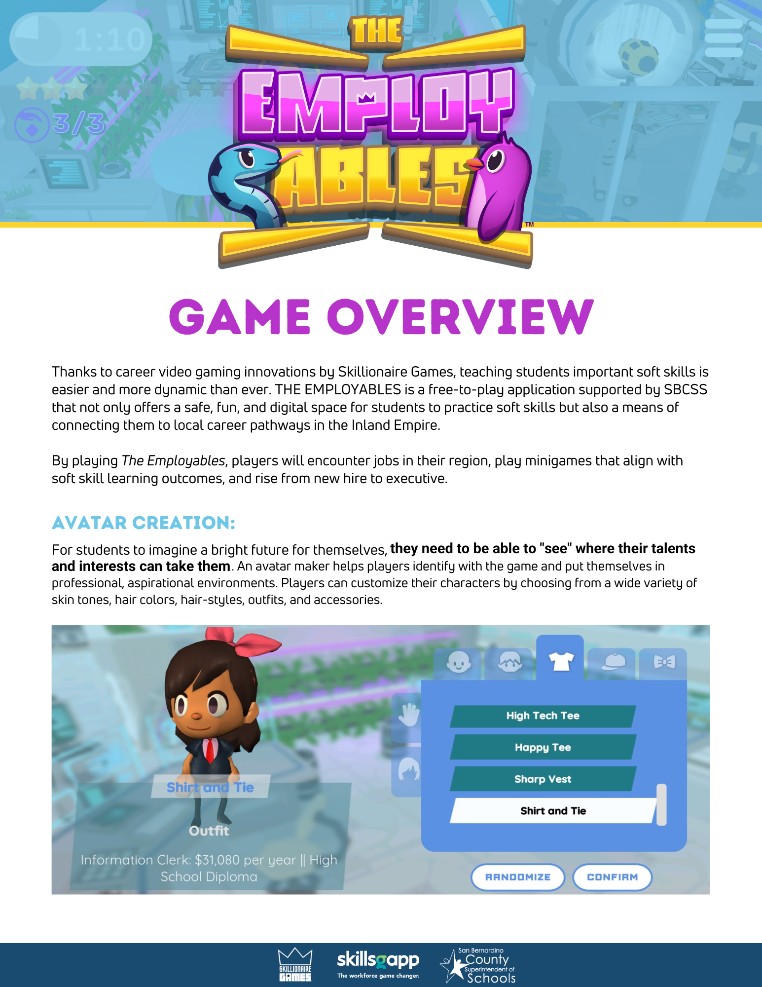 The Employables was designed for meaningful impact with minimal effort from educators. Students can launch the game as new players or through Google Single Sign-On, set up their avatar in under five minutes, and then jump straight into gameplay and industry-informed environments. To ensure students see the Inland Empire’s most relevant career pathways and local companies, please have them enter their local ZIP code during account setup.
