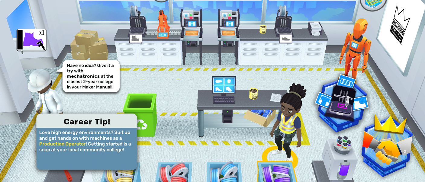 Players prototype, program robots and cobots, assemble products, manage resources, and defend against cyber attacks while learning real-world jobs and terminology along the way..