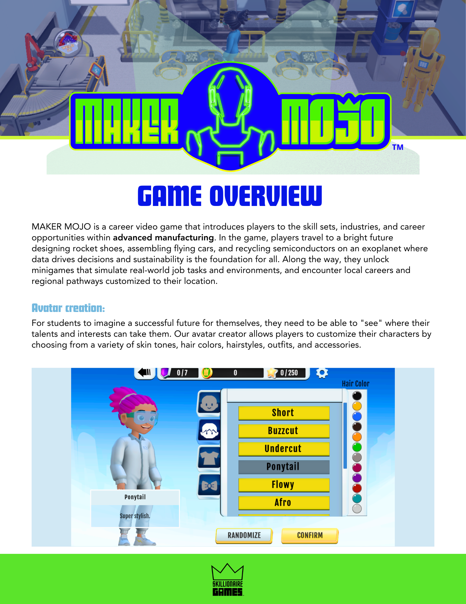 Manufacture a better, cleaner future on your very own exoplanet! Maker Mojo introduces players to the skill sets, industries, and career opportunities within advanced manufacturing.