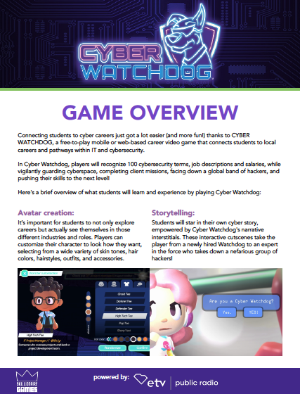 Report for HACKtive duty by taking down a global band of hackers with real-life cyber sims. Cyber Watchdog introduces players to the skill sets, industries, and career opportunities within cybersecurity. Complete field missions, face down a global band of hackers, and push your cyber skills to the next level!